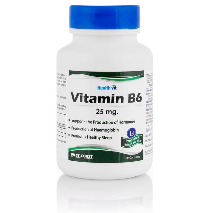 HealthVit Vitamin B6 25mg Capsule Healthvit Vitamin B6 25mg capsule contain viatmin B6 as active ingredient. Key benefits of Healthvit Vitamin B6 25mg capsules: Vitamin B6 is a water-soluble vitamin needed to release energy from food. It Essential for proper nerve function and immune system health. It plays a crucial role in the synthesis of neurotransmitters such as dopamine and serotonin. This helps the human body to withstand a number of infections. Vitamin B6 has a significant role to play in the treatment of premenstrual syndrome occurring in women. Direction to use: As a Dietary supplement for adults, 1 or 2 capsules daily preferably at mealtime or as directed by health practitioner. Safety information: Pregnant, nursing women or individual taking any medications, consult the doctor before use. No artificial colour, flavours or preservative added, no chemical solvents. Use under medical supervision.