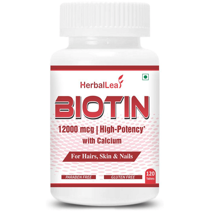 HerbalLeaf Biotin 12000mcg with Calcium Tablet is a perfect blend of Multivitamin, Keratin, Amino Acids, Natural extracts, and minerals. It is a nutritive food for your hair, skin, and nails. The goodness of Biotin, Keratin, and Piperine provides intense nourishment to your hair, making them stronger, lustrous, and healthy. When you integrate Amino Acids and Multivitamins into your daily routine, it positively drives the overall functioning of your body, promotes protein synthesis, and strengthens the immune system. Undoubtedly, these wholesome tablets are food for growing curls and glowing skin! | Key Ingredients: Biotin Vitamin A Vitamin C Vitamin D Folic Acid Lodine Sugar Vitamin B5 Vitamin B12 | Key Benefits: Helps to stimulate hair growth Improves the overall health of the body Helps to strenghten the nail and the hairs Can help to promote the healthy skin | Direction For Use: Use as directed by the label. | Safety Information: Store in a cool and dry place away from directed by the label Keep out of reach of children Do not exceed the recommended dosage