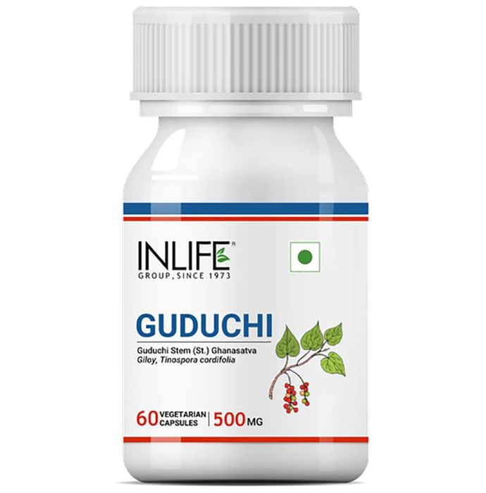 Inlife Guduchi 500mg Vegetarian Capsule INLIFE Guduchi Giloy (Tinospora Cordifolia) Stem Extract for Immune Support Supplement contains Guduchi which has long been used in Ayurvedic medicine in the way of strengthening the immune system and promotes cellular defense. It is a natural way to strengthen the cells of the body. Guduchi Capsules contains extract derived from Guduchi stem standardized to > 3% Bitters. Each capsule contains 500mg of pure Guduchi stem extract. Vegan and vegetarian friendly-INLIFE Guduchi Stem (Giloy) extract vegetarian capsules, is produced in gluten-free capsules and contains no artificial ingredients.