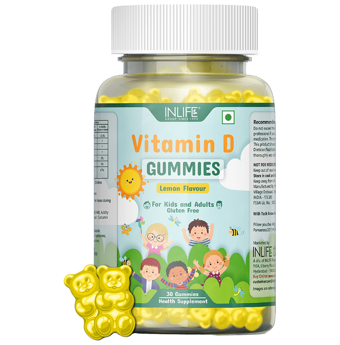 Inlife Vitamin D Gummies Lemon Gluten Free It is a health supplement formulated with vitamin D that promotes your overall health and well-being. Vitamin D is a fat-soluble vitamin that helps the body fight against infections and supports a healthy immune system. It plays a vital role in developing and maintaining healthy bones and assists with the absorption of calcium, magnesium, and phosphorus. These delicious and convenient vitamin C gummies are a great alternative to traditional or chewable pills. | Key Ingredients: Vitamin D | Key Benefits: It is a health supplement formulated with vitamin D that promotes your overall health and well-being Vitamin D is a fat-soluble vitamin that helps the body fight against infections and supports a healthy immune system It helps the body absorb and retain calcium and phosphorus, which are essential for building and maintaining healthy bones It also helps in recycling calcium that would generally be excreted from the kidneys to maintain healthy bones and teeth It helps to support oral health and hygiene by lowering the risk of tooth decay and gum problems | Directions For Use: Take one gummy daily or as directed by your physician | Safety Information: Read the product label carefully before use Store in a cool and dry place away from direct sunlight Consult your physician before taking any supplement Do not exceed the recommended dosage Consult a doctor before taking any supplement if you are lactating or pregnant Do not use if the product appears to be tampered with or the seal is broken