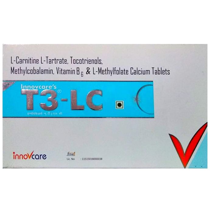 Innovcare's New T3-LC Tablet It is used to prevent and treat low vitamin B12. Lack of vitamin B12 may cause anemia and damage to the nerves. It is useful for diabetic neuropathy and peripheral neuropathy. It is an essential nutrient that helps the body make healthy red blood and nerve cells. | Key Ingredients L Methylfolate Adenosylcobalamine Pyridoxal-5-phosphate Calcium Orotate Vitamin D3 / Cholecalciferol | Key Benefits: It is used to prevent and treat low vitamin B12 It is useful for diabetic neuropathy and peripheral neuropathy It is an essential nutrient that helps the body make healthy red blood and nerve cells | Directions For Use: Use as mentioned on the label or directed by the physician | Safety Information: Read the label carefully before use Store in a cool dry place Keep out of reach of children
