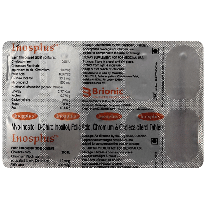 Inosplus Tablet may help balance hormones in the body. It can be effective in dealing with anxiety and stress. Furthermore, it may help the proper functioning of insulin. | Key Ingredients: Myo-inositol D-Chiro inositol Folic acid Chromium Cholecalciferol | Key Benefits: This tablet can be effective in dealing with metabolic syndrome and polycystic ovary syndrome (PCOS) It can improve the sensitivity of the body toward insulin and help regulate glucose levels It may improve the reproductive health of women | Directions For Use: Use as directed on the label or as advised by your healthcare provider. | Safety Information: Read the label carefully before use Do not exceed the recommended dosage Store in a cool and dry place away from direct sunlight Keep out of reach of children
