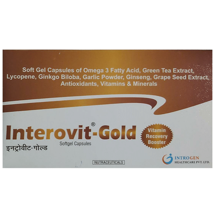 Interovit-Gold Softgel Capsule is a nutritional supplement containing multivitamins, multiminerals and antioxidants that improve overall health and wellness. It helps to fight infections by boosting immunity. Also, it helps to overcome weakness, stress, exhaustion and extreme tiredness. | Key Ingredients: Omega 3 fatty acid Green tea extract Lycopene Garlic powder | Key Benefits: It contains omega 3 fatty acids that can improve overall health Omega-3-fatty acids combinations contain important building blocks of the body that helps to maintain good health It is a nutritional supplement containing multivitamins, multiminerals and antioxidants that improve overall health and wellness It helps to fight infections by boosting immunity | Directions For Use: Use as directed on the label or as suggested by health care professionals. | Safety Information: Store in a cool and dry place away from direct sunlight Read the label carefully Keep out of reach of children