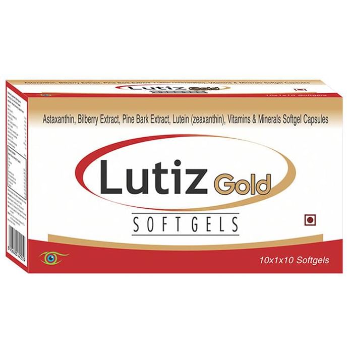 Lutiz Gold Soft Gelatin Capsule Lutiz Gold Capsule is a unique super-powerful composition of Multivitamin, and Antioxidants for eye care, containing Vitamin C, Bilberry Extract 7 percent, Zinc Oxide, Pine Bark Extract, Vitamin E Acetate, Lutein 100%, Zeaxanthin, Cupric Oxide, Selenium dioxide, Vitamin B12, Vitamin A, and Astaxanthin. Lutiz gold Capsule functions as a eye protective agent that protects retinal ganglion cell from oxidative stress. Lutein lowers the risk of cataract and Advanced Age Related Macular Degeneration. A combination of Vitamins, Zinc, and Copper helps prevent Age related eye disorders. Lutiz gold Capsule helps maintains transparency of lens reducing the risk of cataract, and defies the ageing process. Lutiz gold Capsule blocks the damage caused by free radicals. Use under medical supervision.