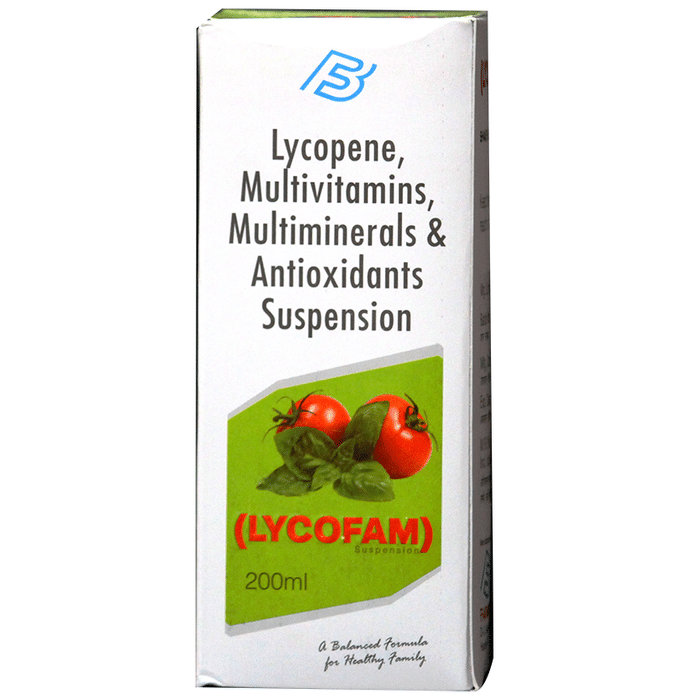 Lycofam Syrup Lycofam Syrup is a health supplement containing lycopene which helps against symptoms of high cholesterol, heart disease, cancer and many other ailments. Its formula is enriched with Multivitamins, Minerals and Antioxidants that promote general well being and boost immunity and other primary functions.