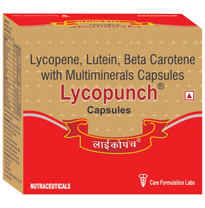 Lycopunch Capsule is a mineral that has antioxidant properties and may help protect cells from the damage caused by free radicals. | Key Ingredients: Lycopene Lutein Beta Carotene | Key Benefits: Lycopene is an antioxidant that protects the body from damage caused by compounds known as free radicals Lycopunch capsule may also protect against cancers of the lungs, breasts and kidneys It helps increase the skin’s defence against sunburns and damage caused by UV rays | Directions For Use: Take one capsule daily or as directed by the physician. | Safety Information: Read the label carefully before use Do not exceed the recommended dosage Store in a cool and dry place Keep it away from the reach of children
