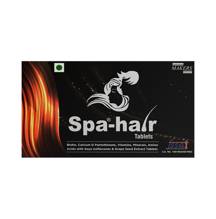 Makers Spa-Hair Tablet is a multivitamin nutritional supplement that helps in hair growth and prevents hair fall. It is used as a nutritional supplement in various cases of deficiency of vitamins or in cases where there is an increased requirement of the vitamins and minerals present in Spa Hair tablets. Along with Biotin, Iron, Copper, Zinc, Selenium, Spa Hair new tablet is for hair growth and has 8 essential and 10 non-essential amino acids which are naturally present in the hair. It is used to improve hair growth. The product works on the cellular levels and within the scalp, both of these actions improving hair growth. It boosts the health of hair by making them strong, thick, and silky. The Spa Hair tablet contains a rich formulation of vitamins, amino acids, and minerals that promote healthy hair. B-complex vitamins are needed for hair growth. Biotin is a water-soluble vitamin, part of the vitamin B family. Its deficiency is known to cause hair loss along with signs of skin rashes and brittle nails. This is the reason why biotin is a common vitamin used in supplements for hair growth. The vitamin is known to improve hair growth as well as prevent hair loss in adults and kids. Vitamin B9 acts as a coenzyme in the synthesis of nucleic acid and red blood cells, which is responsible for oxygen supply and thus hair growth. It is also known to stimulate the rebuilding of hair follicles, prevent greying of hair and hair loss while regulating the secretion of sebum. Spa Hair Tablet is used for the treatment of hair fall, premature, baldness, weak nails and other related conditions. Spa Hair Tablet comprises biotin as its primary ingredient and it works by reducing biotin deficiency and the primary reason behind hair fall and related issues. | Key Ingredients: L-Arginine: 11.7mg L-Cysteine: 3.6mg L-Methionine: 5mg L-Lysine Hydrochloride: 16.6mg Zinc -10mg Iron (Ferrous Fumarate): 10 mg Calcium Pantothenate: 100mg Copper (Cupric Sulphate Pentahydrate): 1.7 mg Selenium (Sodium Selenate Pentahydrate): 40mcg Biotin: 30 mcg Magnesium- 100mcg L-Alanine- 8.6mg L-Aspartic Acid- 25mg L-Glutamic Acid- 35.6mg Glycine- 8.6mg L-Histidine-9mg L-Leucine-5.3mg Lysine-16.6mg L-Phenylalanine-8.6mg L-Proline-8mg L-Serine-13mg L-Threonine L-Tryptophan-03mg L-Tyrosine-9mg L-Valine-5.7mg | Key Benefits: Spa Hair New is suitable for all hair types Helps in improving the health of the skin and hair due to the presence of B-complex vitamins Boosts the growth of hair by improving the healthy hair cells Strengthens hair follicles, thereby helping you to fight hair fall or hair loss Makes your hair thick, strong and healthy and stronger Adds shine and volume to the hair Increases the circulation of blood and thus promotes the supply of nutrients to the hair and other parts of the body Prevents the hair from becoming dry and frizzy Suits both men and women dealing with hereditary hair loss Strengthens the hair from the roots and makes them healthy and strong | Directions For Use: For hair growth with shiny and healthy hair, a person must consume one tablet every day after a healthy meal for a minimum period of 3 months. It can either be consumed with a glass of water or juice for best results or as directed by a healthcare professional Take it at the same time every day as this will help you remember when to take it In case you miss a dose, take it as soon as you remember. However, if it's almost time for the next dose, skip the dose you missed and take your next dose at the scheduled time | Safety Information: Read the label carefully before use Store in a cool and dry place away from direct sunlight Keep out of reach of the children If you are pregnant, breastfeeding, or have any existing medical condition like diabetes, hypertension, kidney, or liver problem, it is wise to consult your doctor before taking this tablet Remember, vitamin supplements are intended to supplement the diet of people who fail to meet the requirement through diet. It should not be used as a substitute for a well-balanced diet and a healthy lifestyle Do not exceed the recommended dosage of the tablet These tablets are usually safe and don’t cause any side effects when taken as per the doctor's recommendation. However, when taken in a higher dose, it may cause certain side effects such as nausea, diarrhea, vomiting, stomach upset, constipation, etc. If any of these effects persist or worsen, then it is wise to contact your doctor promptly Use under medical supervision Avoid contact with eyes, eyelid areas, nostril areas