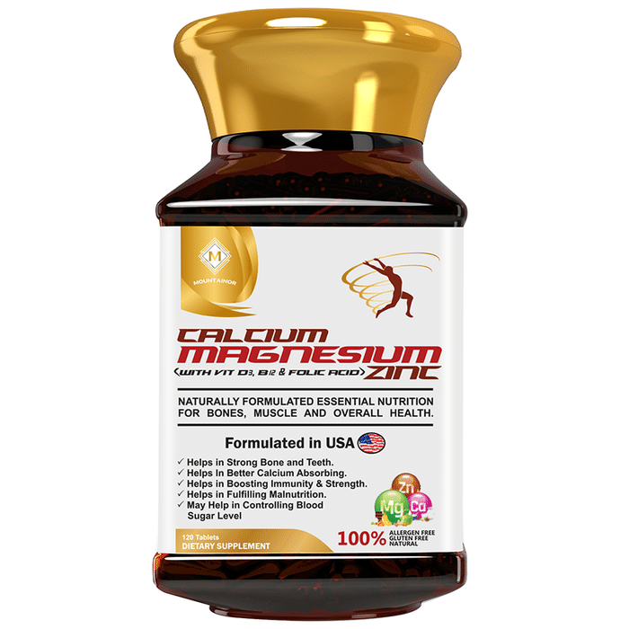 Mountainor Calcium Magnesium Zinc with Vit D3, B12 & Folic Acid Tablet supports the health of musculoskeletal and nervous systems; along with physical activity, it may help reduce the risk of osteoporosis later in life. It contains magnesium which helps to regulate calcium transport. It stimulates the secretion of calcitonin, a hormone that aids in the influx of calcium to the bone. Besides, it also plays an important role in protein formation. Zinc, a trace mineral, plays a role in the synthesis of collagen in bone tissue, as well as immune system health. It makes for a perfect prenatal supplement for a healthy pregnancy. | Key Ingredients: Calcium Magnesium Zinc Copper AAC Manganese Vitamin D3 Mineral Vitamin B 12 | Key Benefits: It helps in getting strong bones and teeth It leads to better absorption of calcium It boosts immunity and strength It fulfills malnutrition It may control blood sugar levels It reduces the risk of osteoporosis It improves sleep quality | Directions For Use: Take 1 capsule in the morning, 1 in the evening with water after meals, or as directed by your physician/nutritionist/health practitioner. | Safety Information: Read the label carefully before use Store in a cool and dry place away from direct sunlight Keep out of reach of the children Do not exceed the recommended dose Pregnant or nursing mother, children under 18 and individuals with a known medical condition should consult a physician before use Do not use if on prescription medicine or have strong allergies
