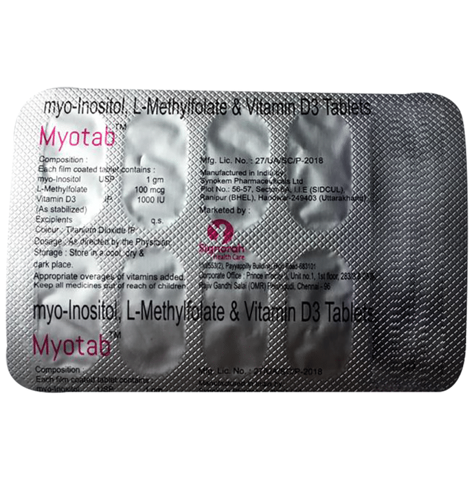Myotab Tablet It is a PCOS supplement for women, formulated with a powerful blend of myo-inositol, methyl folate, and vitamin D3. It helps to regularise the menstrual cycle by balancing LH (Luteinizing hormone) and FSH (Follicle-stimulating hormone). It helps reduce various PCOS symptoms like acne, facial hair, and hair loss. | Key Ingredients: Myo-inositol L-methylfolate Vitamin D3 | Key Benefits: It is a plant-based PCOS supplement to support healthy reproductive health in women It helps to regularise the menstrual cycle by balancing LH and FSH It helps in reducing various PCOS symptoms like acne, facial hair and loss of hair It can help regulate hormonal balance in the body, reduce stress and improve mood | Directions For Use: Use as directed on the product label or your physician | Safety Information: Read the product label carefully before use Store in a cool and dry place away from direct sunlight Keep out of reach of children Consult a doctor before taking any supplement Do not exceed the recommended dosage Pregnant or nursing mothers, children, and people with medical conditions must consult a physician before taking this supplement