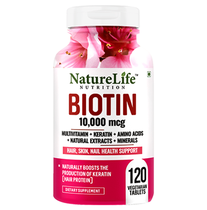 Nature Life Nutrition Biotin 10000mcg Multivitamin+Keratin+Amino Acids+Natural Extracts+Minerals Vegetarian Tablet Nature Life Nutrition Biotin 10000mcg Multivitamin+Keratin+Amino Acids+Natural Extracts+Minerals Vegetarian Tablet is a perfect blend of Multivitamin, Keratin, Amino Acids, Natural extracts, and minerals. It is a nutritive food for your hair, skin, and nails. The goodness of Biotin, Keratin, and Piperine provides intense nourishment to your hair, making them stronger, lustrous, and healthy. When you integrate Amino Acids and Multivitamins into your daily routine, it positively drives the overall functioning of your body, promotes protein synthesis, and strengthens the immune system. Undoubtedly, these wholesome tablets are food for growing curls and glowing skin!