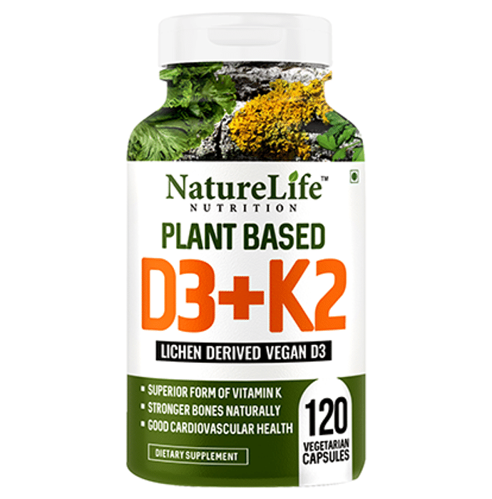 Nature Life Nutrition Plant Based D3+K2 Vegetarian Capsule provides dual support to your bone and heart health. Made with the goodness of plant-based extracts like Mustard Green, Spinach Leaves, Beetroot, Parsley Leaves, and Lichen, these capsules assist in faster calcium absorption, strengthen bones, boost immunity and support good cardiovascular health. Vitamin D3 amplifies proper calcium absorption and balances adequate calcium levels in your blood. But only Vitamin D3 is not sufficient. You need to complement it with Vitamin K2 for maximum benefit as it discourages calcium from accumulating in and around your soft tissues like the heart, joints, and kidneys and ensures a healthy and accurate calcium balance for your optimal bone health. This dual vitamin power is all you need to nutrify, solidify and glorify your bones and heart! | Key Ingredients: Lichen Mustard Green Spinach Leaves Beetroot Parsley Leaves | Key Benefits: A superior form of vitamin K Makes the bones stronger Promotes cardiovascular health | Directions For Use: As directed by the dietician and nutritionist. | Safety Instructions: Read the label carefully before use Store in a cool dry place away from direct sunlight Keep out of reach of the children