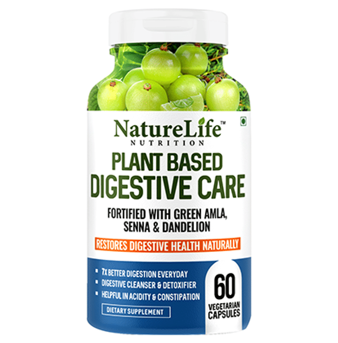 Nature Life Nutrition Plant Based Digestive Care Vegetarian Capsule are developed to ensure smooth digestive functioning. A blend of natural ingredients like Green Amla, Senna Leaves, Green Ginger, Mint Leaves, Thyme, Dill Seeds and Dandelion Root Powder, the capsules assist in proper absorption of nutrients, strengthen the immune system, comfort gut health, enhance cognitive functioning, regulate blood pressure levels and battle against digestive issues. In short, it promotes a healthy gut for a wealthy life! | Key Ingredients: Green Amla Senna Leaves Green Ginger Mint Leaves Thyme Dill Seeds Dandelion Root Powder | Key Benefits: Promotes 7x better digestion everyday Works as a digestive cleanser and detoxifier Helpful in acidity and constipation | Directions For Use: As directed by the dietician and nutritionist. | Safety Instructions: Read the label carefully before use Store in a cool dry place away from direct sunlight Keep out of reach of the children Use under medical supervision