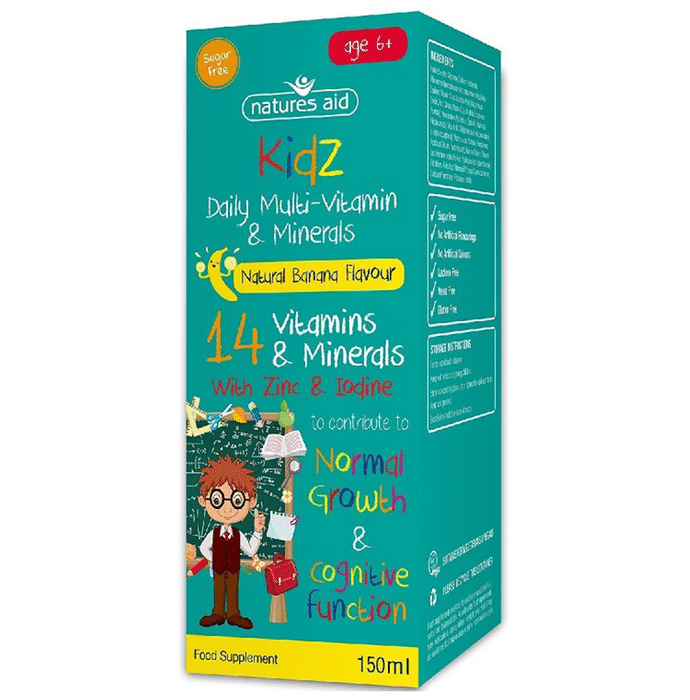 Natures Aid Kidz Multi-Vitamin & Mineral Liquid Age 6+ Banana Natures Aid Kidz Multi-Vitamin & Mineral Liquid Age 6+ contains 14 Vitamins and Minerals for normal growth and cognitive function for your child. It is sugar free and contains no artificial flavours or colours.