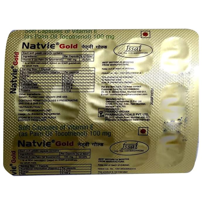Natvie Gold Capsule Vitamin E helps manage age-related hyperpigmentation or hyperpigmentation arising from sun exposure by suppressing the melanin production in the skin. Vitamin E is the major lipid-soluble antioxidant in the cellular antioxidant system. | Key Ingredients: Vitamin E | Key Benefits: Vitamin E helps protect the skin from the adverse effects of UV-induced oxidative stress It helps restore a defective skin barrier and control water loss from the skin surface, improves skin smoothness, and maintains youthful skin It could help to manage age-related hyperpigmentation It also helps maintain the health of vital organs, including the heart, eye, and brain, by neutralising excess free radicals | Directions For Use: Use as directed on the label or as advised by your healthcare provider. | Safety Information: Read the label carefully before use Store in a cool and dry place away from direct sunlight Keep out of reach of children