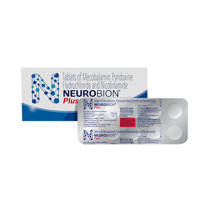Neurobion Plus Tablet is a health supplement that helps regulate bodily functions like cellular function, blood formation and protein synthesis. It helps strengthen the immune system and promotes overall health. | Key Ingredients: Mecobalamin, Pyridoxine, Nicotinamide | Key Benefits: Mecobalamin promotes normal brain development and nerve function Pyridoxine aids in the formation of red blood cells and helps boost the immune system Nicotinamide is a form of vitamin B3 that provides vital nutrients to the body | Good to Know: Involves protein, fat and carbohydrate metabolism and improves energy levels | Effects of Deficiency: Lack of vitamins and folic acid can cause: Weakness Fatigue Nutritional deficiencies | Product Form: Tablet | Directions for Use: As prescribed by your medical practitioner | Safety Information: Store in a cool and dry place, away from sunlight Do not exceed the recommended dosage Keep out of reach of children | Frequently Asked Questions: | Q. What are the different types of nutritional supplements? Dietary supplements can come in the form of tablets, capsules, gummies, powders, drinks, and energy bars. | Q. What do nutritional supplements do? Nutritional supplements provide essential nutrients that the body may not get from a regular diet.