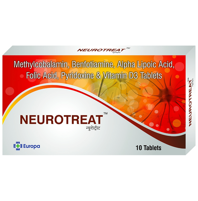 Neurotreat Tablet contains a magnificent blend of Methylcobalamin, Alpha Lipoic Acid (ALA), Benfotiamine, Pyridoxine, Folic Acid and Vitamin D3. Methylcobalamin is used to treat Vitamin-B12 deficiencies leading to plethora of health benefits. Benfotiamine reduces the cell death, improves nerve sensation and protects brain tissues. Alpha lipoic acid is a very potent antioxidant that is made by the body and is found in every cell where it helps turn glucose into energy. Pyridoxine is required to boost metabolism of fats and proteins and maintaining health of nerves and RBCs. Folic acid helps in the development of a healthy red blood cells, improves nervous system and heart health. Vitamin D3 is vital for the day to day functioning of the nervous system. Vitamin D3 also helps in regulating blood calcium levels, as well promotes bone growth and bone density.It is formulated to enhance antioxidants, improve neuropathy and promote overall health and wellbeing. | Key Ingredients: Methylcobalamin Alpha Lipoic Acid (ALA) Benfotiamine Pyridoxine Folic Acid Vitamin D3 | Key Benefits: Helps in reducing Vitamin-B12 deficiencies Helps in improving nerve sensation and protects brain cells It has antioxidant properties and boosts metabolism of fats and proteins Supplements vitamin D3 which supports healthy functioning of nervous system Promotes growth and density of bones | Directions For Use Dosage should be directed by the physician. | Safety Information: Read the label carefully before use Use under medical supervision Keep away from children Do not exceed the recommended dosage Store in a cool and dry place