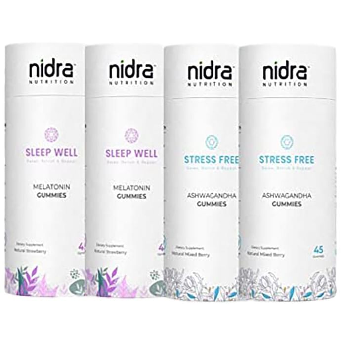 Nidra Nutrition Combo Pack of 2 Bottle of Stress Free Ashwagandha Gummies Natural Mixed Berry & 2 Bottle of Sleep Well Melatonin Gummies Natural Strawberry (45 Each)