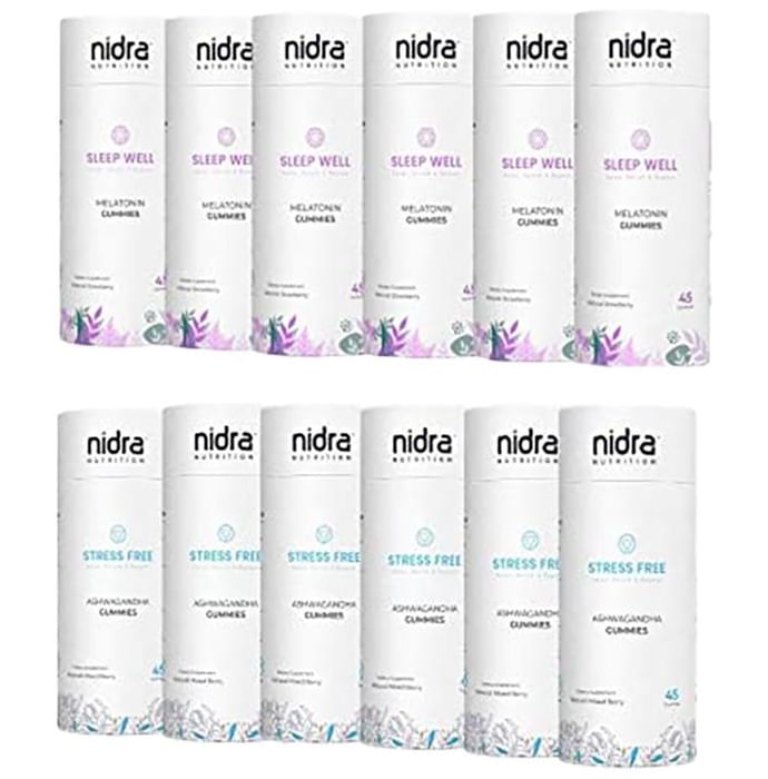 Nidra Nutrition Combo Pack of 6 Bottle of Stress Free Ashwagandha Gummies Natural Mixed Berry & 6 Bottle of Sleep Well Melatonin Gummies Natural Strawberry (45 Each)