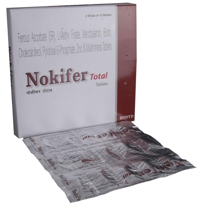 Nokifer Total Tablet is an iron supplement used to counter iron deficiency either due to chronic blood loss or poor absorption. | Key Ingredients: Ferrous ascorbate L-Methyl folate Mecobalamin Biotin Cholecalciferol Pyridoxal-5-Phosphate Zinc | Key Benefits: Prevents vitamin deficiency due to poor diet, certain illnesses, or during pregnancy Vitamins and iron functions as building blocks of the body and facilitates overall good health Helps in the formation of heme, the iron-containing protein in hemoglobin necessary for the formation of red blood cells Beneficial in the case of anemia as the tablet prevents low folate levels in the body Pyridoxal-5-Phosphate facilitates normal functioning of the brain | Directions For Use: Take Nokifer Total Tablet as directed by the physician. | Safety Information: Read the label carefully before use Do not exceed the recommended dose Keep out of the reach of children Store at a temperature below 25-degree Celsius and 40 % humidity in cool and dry place Should be protected from direct light