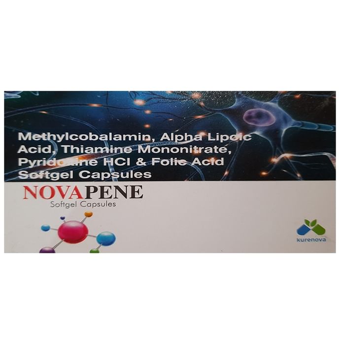 Novapene Softgel Capsule benefits the body by providing nutritional support. It contains Methylcobalamin, which aids in the replenishment of vitamin B12, which is required for proper brain and nerve function. It also contains Folic acid, which helps red blood cell formation. | Key Ingredients: Alpha lipoic acid Thiamine mononitrate Folic acid Pyridoxine HCI Methylcobalamin | Key Benefits: Novapene Softgel Capsule is beneficial for providing nutritional support to the body It contains Methylcobalamin which helps in fulfilling the deficiency of vitamin B12 which is essential for brain and nerve functions It also contains Folic acid which aids in the formation of red blood cells | Directions For Use: Use as directed on the label or as advised by your physician. | Safety Information: Read the label carefully before use Do not exceed the recommended dosage Store in a cool and dry place away from direct sunlight Keep out of reach of children