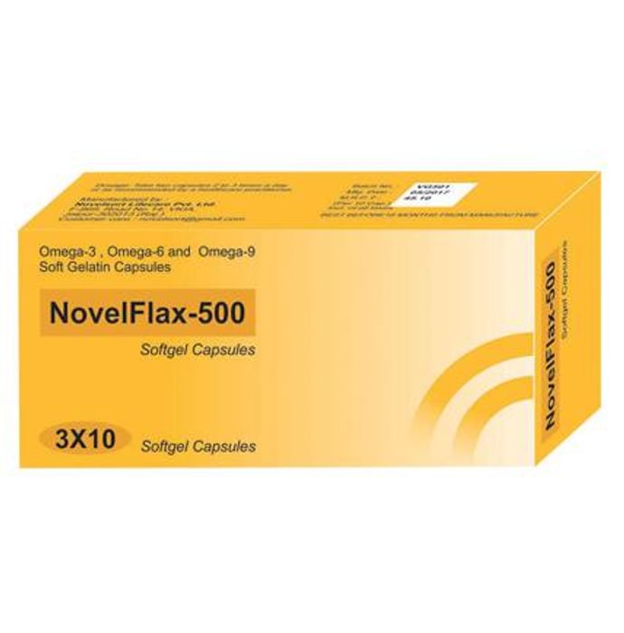 NovelFlax -500 Soft Gelatin Capsule is a dietary supplement containing benefits of flax seeds. It shows various health benefits of brain and body. | Key Ingredients: Omega-3,6,9 | Key Benefits: Omega-3,6 and 9 support brain and eye health Omega-3,6 and 9 help treat symptoms of depression and anxiety Omega-3,6 and 9 are essential for maintaining eye health such as eye vision and power Omega-3,6 and 9 play essential role in development of brain of fetus during pregnancy Omega-3,6 and 9 reduce risk of cardiovascular problems by controlling triglycerides level | Directions for Use: As directed by the physician. | Safety Information: A dietary supplement, not intended for medicinal use Read the label carefully before use Store in cool and dry place, away from direct sunlight Keep out of reach of the children If pregnant or lactating women, please consult the physician before taking this supplement