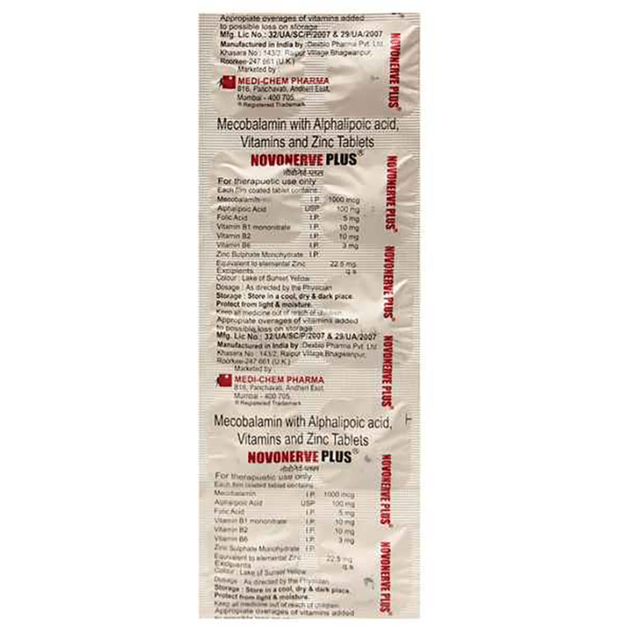 Novonerve Plus Tablet Novonerve Plus tablet is a combination of Methylcobalamin, Alpha Lipoic Acid, Zinc, Vitamin B1, B2, Pyridoxine and Folic acid. Methylcobalamin is used in peripheral neuropathy, diabetic neuropathy etc. It is a form of vitamin B12. This vitamin is one of two active coenzymes used by B-12 dependent enzymes in the body. Methylcobalamin is notable for being one of the few examples in nature of an organometallic bond. Methylcobalamin is used in treating diseases of vitamin B12 deficiency (such as pernicious anemia), or diseases of effective B12 deficiency, such as vitamin B12 metabolic pathway. Methylcobalamin is retained in the body better than cyanocobalamin. Vitamin B1 and B2 helps in growth and good health useful to stop or treat deficiency. The trio of Methylcobalamin, Pyridoxine and Folic acid helps in bringing down the level of homocysteine in blood, the major factor for atherosclerosis. Thus, Novonerve Plus tablet reduces the major risk factors for atherosclerosis and neuropathies. Use under medical supervision