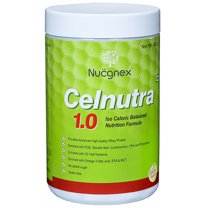 Nucgnex Celnutra 1.0 Powder Creamy Vanilla is a complete and balanced nutrition supplement, designed for adults. It helps increase muscle mass, provides energy, boosts immunity and supports digestive health. | Key Ingredients: Whey protein | Key Benefits: It is a high protein drink specially formulated for adults It provides complete and balanced nutrition to adults It contains vital nutrients to support muscle mass It promotes fat metabolism and energy gain | Directions For Use: Use as directed on the label or as advised by your healthcare provider. | Safety Information: Read the label carefully before use Store in a cool and dry place away from direct sunlight Keep out of reach of children