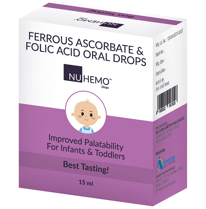 Nuhemo Oral Drops Nuhemo Oral Drops Carefully designed for infants and toddlers, this formula is a powerful combination of folic acid or vitamin b9 and ascorbic acid or ferrous ascorbate. It comes with refined palatability.