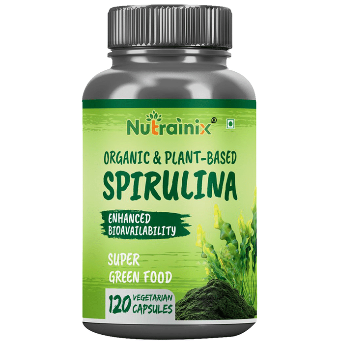 Nutrainix Organic & Plant-Based Spirulina Vegetarian Capsule is suggested for increasing the strength of the immune system and also aids in ridding the liver of any toxins hence, cleansing it. | Key Ingredients: Spirulina | Key Benefits: Spirulina is a single cell plant from the blue-green algae species It is used in helping cleanse the liver of any toxins It helps in boosting energy levels in the body It is used to strengthen the immune system Considered being a natural source of minerals, proteins, enzymes and chlorophyll Chlorophyll helps neutralize free radicals which cause damage to the cells Contains essential minerals, fatty acids, phosphorous, selenium, potassium and magnesium | Directions For Use: Use as directed by the physician. | Safety Information: Read the label carefully before use Store in a cool dry place away from direct sunlight Keep out of reach of the children