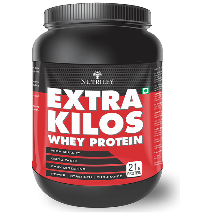 Nutriley Extra Kilos Whey Protein Powder is an easy way to gain and maintain weight. It is 100% vegetarian product, therefore it can be taken without any hesitation. A balanced formulation of high quality proteins, carbohydrates, fats, minerals and vitamins. Available in different flavours like chocolate, strawberry, banana, mango, elaichi, kesar-pista-badam, vanila, and american ice cream. | Key Ingredients: Whey protein Skimmed milk powder Crushed sugar Tal Makahana(Asteracantha longifolia) Ashwagandha(Withania somniferra) Vidhari Kand(Pueria tuberosa) Safed Moosali(Asparagus adsecendens) Salam Mishri(Orchid mascula) Khajoor(Phoenix sylvestris) Munnaka(Vitis venifera) | Key Benefits: Extra kilos gives vital nutrients and energy that helps in gaining optimum weight. It comprises of proteins, carbohydrates, fats, minerals and vitamins It is designed to give the best possible amino acid profile with rapid absorption for powerful and super-effective lean muscle gain. Whey protein along with vitamin A, E and zinc boost the immune system and act as natural antioxidant against free radicals It is specially formulated for weight gaining, muscle building, body builders, power lifter, athletes, gymnasts and other who require continuous energy flow. Helps to overcome fatigue and increases stamina This protein powder is not just for the athletes or body builders. However, It supports the muscle maintenance, buildup and toning among individuals who what to gain weight and tone up their body It is also a nutritional intake of choice for those who want to lead an active lifestyle and gain weight | Directions For Use: Add 30g of supplement to a glass of 250-300 ml of milk Stir well to get smooth drink Take the delicious and nutritious drink with 2-3 bananas for faster weight gain Take twice or thrice a day or as directed by the healthcare professional | Safety Information: Store in a cool, dry place and keep it away from direct sunlight and moisture A dietary nutritional supplement not for medicinal use This product is not intended to diagnose, treat, cure, or prevent any disease Read the label carefully before use Do not exceed the recommended dose Keep out of the reach of children