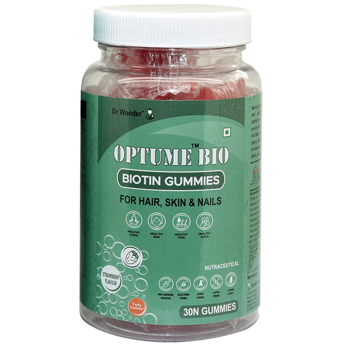 Optume Bio Biotin Gummies is biotin gummy to help maintain health for hair, skin and nails. It has a natural flavour and does not contain sugar. These chewable soft gummies are vegetarian and drug-free nutraceuticals product. | Key Ingredients: Aloe vera Hibiscus flower extract Rosemary extract Turmeric extract Vitamin B7 | Key Benefits: It helps promote healthy living, skin, hair and nails It is suitable for adults and children It is non-allergic and has no side effects It is gluten, GMO, Soy, and corn-free It is GMP, FSSAI, ISO and HACCP certified | Directions For Use: 1-4 years age- 1 gummies 4-6 years age- 2 gummies 6-18 years age- 3 gummies Above 18 years age- 4 gummies Chew anywhere and any time of the day without water | Safety Information: Read the label carefully before use Store in a cool and dry place, away from sunlight Keep out of reach of children