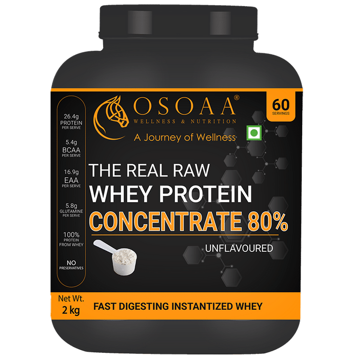 OSOAA The Real Raw Whey Protein Concentrate 80% Unflavored This whey protein concentrate contains complete protein with all 14 essential amino acids that can help improve muscle protein synthesis and build lean muscle mass. It is rich in EAAs, BCAAs, and Glutamine which are muscle-building blocks and may enable faster recovery post workouts. It can increase immunity and bodily resistance. | Key Ingredients: Whey protein concentrate 80% | Key Benefits: This whey protein concentrate is a source of complete protein with all 14 essential amino acids It is rich in EAAs, BCAAs, and Glutamine which are muscle-building blocks It can help improve muscle protein synthesis and build lean muscle It may enable faster recovery post workouts It can boost immunity and bodily resistance | Directions For Use: 1 scoop per serve 1-2 servings in one day in between meals or at any time of the day | Safety Information: Lactating or pregnant women and people with any medical condition should consult a physician before consuming this product Keep out of reach of children Do not exceed recommended daily usage Store in a cool and dry place