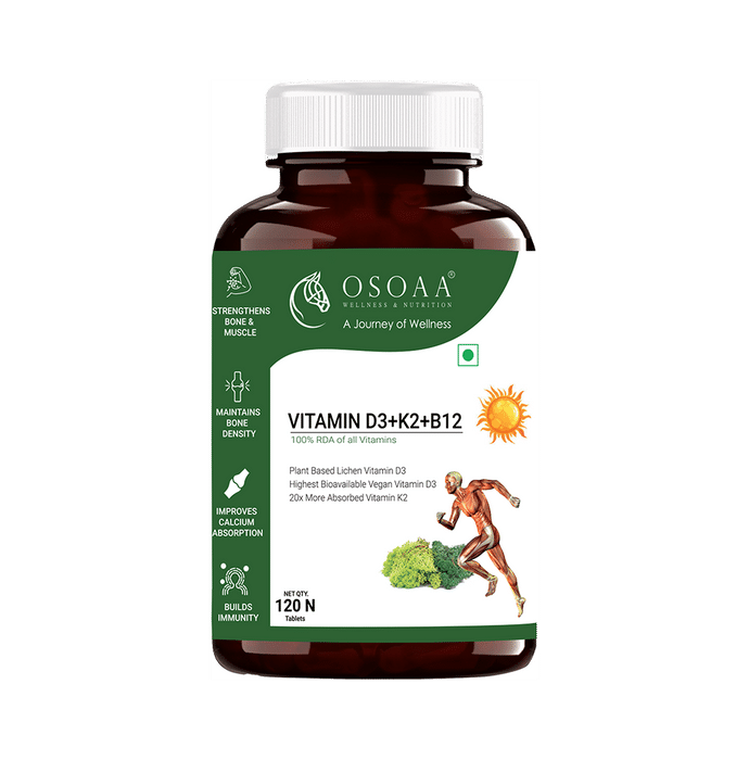 OSOAA Vitamin D3+K2+B12 Tablet OSOAA Vitamin D3+K2+B12 Tablet is a health supplement formulated with vegan plant-based vitamins for stronger bones and immunity. It contains a top-grade form of Vitamin D3 which is also present in the sunlight. It can help in adequate absorption of calcium into the bones to help strengthen bones and muscles, regulate bone mineral density, and also boost immunity.