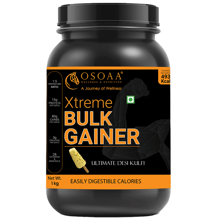 OSOAA Xtreme Bulk Gainer Ultimate Desi Kulfi OSOAA Xtreme Bulk Gainer This workout supplement contains Creatine, Glutamine, and Citruline, which may help boost exercise and workout performance. It can enhance mass and strength with proteins, complex carbohydrates and essential fatty acids. It may aid in faster recovery after workout sessions.