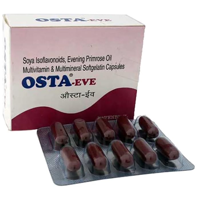 Osta Eve Capsule Osta Eve Capsules is an ideal supplement for middle-aged women which contains Soya Isoflavonoids, Evening Primrose Oil, Vitamin E Acetate, Vitamin C, Vitamin B6, Vitamin B12, Niacinamide, Folic Acid, Dibasic Calcium Phosphate, Magnesium Sulphate, Zinc Sulphate, and Biotin. Soy Isoflavones provides menopause relief by naturally relieving hot flashes & night sweats. Soy isoflavones is necessary to achieve health benefits. Evening Primrose Oil is a rich source of omega 6 essential fatty acids and gamma-linoleic acid, which is converted in the body to form prostaglandins a hormone-like substance. Evening primrose oil capsules are also beneficial in lowering blood cholesterol, reducing blood pressure, decreasing anxiety and maintaining healthy skin and hair. Vitamin E is an antioxidant which fights the free radicals & reduce its damaging effects, thus exhibiting positive effect on growth, energy and appetite. Vitamin C helps in nourishing the skin and acts an anti-ageing agent. Use under medical supervision