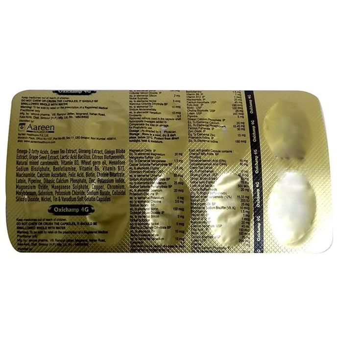 Oxichamp 4G Soft Gelatin Capsule includes omega-3, which can be converted into compounds that reduce inflammation, such as prostaglandins and leukotrienes, which are thought to strengthen joints by enhancing flexibility and mobility and relieving pain. It is a rich source of heart-healthy essential fatty acids and aids in the promotion and maintenance of a healthy heart and brain. | Key Ingredients: Ginseng Grape seed extracts Ginkgo biloba Antioxidants Omega 3 fatty acids Vitamins Minerals Zinc | Key Benefits: It supports joints by promoting flexibility as well as mobility and provides pain relief This advanced formula improves brain function and memory, controls haemoglobin, promotes nerve function, boosts metabolism, helps in mood management and your ability to focus and multitask with ease It promotes hair growth and prevents hair loss by providing essential proteins and nutrients to hair follicles and skin Omega-3 helps increase the level of HDL (good cholesterol) in men who are obese and insulin-resistant HDL cholesterol protects against atherosclerosis, thickening of arteries, by removing excess cholesterol from arterial cells It may help lower blood triglyceride levels and blood pressure It is an effective heart health supplement as it makes it harder for blood to clot It improves cognition, and focus and has a positive impact on brain health | Directions For Use: Use as directed on the label or as advised by your healthcare provider. | Safety Information: Read the label carefully before use Store in a cool and dry place away from direct sunlight Keep out of reach of children