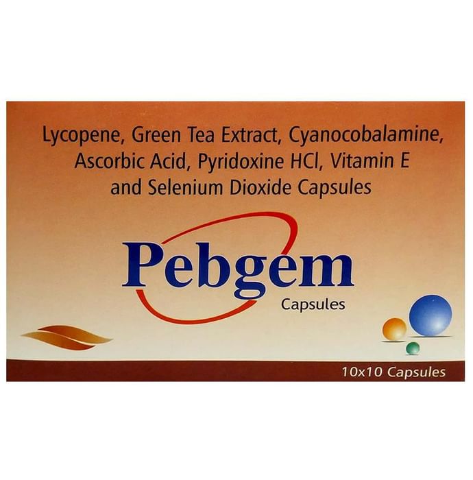Pebgem Capsule Pebgem Capsule is a nutritional supplement which contains Lycopene, Vitamin E, Vitamin C, Zinc Suphate, Sodium Selenate, Vitamin B1, Vitamin B2, Vitamin B6, Proteins & Carbohydrate. Benefits of key ingredients: Lycopene is allegedly a more effective antioxidant than other of its carotenoid cousins which include beta-carotene. Its powerful antioxidant actions are effective in maintaining the strength, thickness and fluidity of cell membranes. Cell membranes are the guardians of cells. They are responsible for screening what goes in and out of cells. They allow good nutrients in and remove cellular junk and prevent toxins from entering the cells. Strong healthy cell membranes are vital in the prevention of many diseases. Vitamin E is an antioxidant which fights the free radicals & reduce its damaging effects, thus exhibiting positive effect on growth, energy and appetite. Vitamin C is a water-soluble vitamin that is necessary for normal growth and development. It is an antioxidant that helps maintain the connective tissue protein collagen, protects against infection, and helps in iron absorption. Pyridoxine is important for the breakdown of protein, fats, and carbohydrates from foods. Usage of Pebjem Capsule prevents from heart problems, Convalescence and General debility Use under medical Supervision