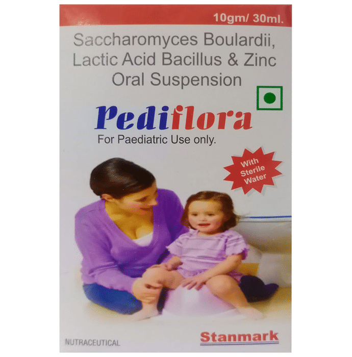 Pediflora Oral Suspension is an oral suspension for kids that provide relief from digestive ailments. It helps strengthen the digestive system. | Key Ingredients: Saccharomyces boulardii Lactic acid bacillus Zinc | Key Benefits: Saccharomyces boulardii helps treat and prevent diarrhoea Lactic acid bacillus helps in restoring good bacteria in the gut Zinc helps in the production of digestive enzymes | Directions For Use: Use as directed on the label | Safety Information: Read the label carefully before use Store in a cool and dry place, away from sunlight Keep out of reach of children