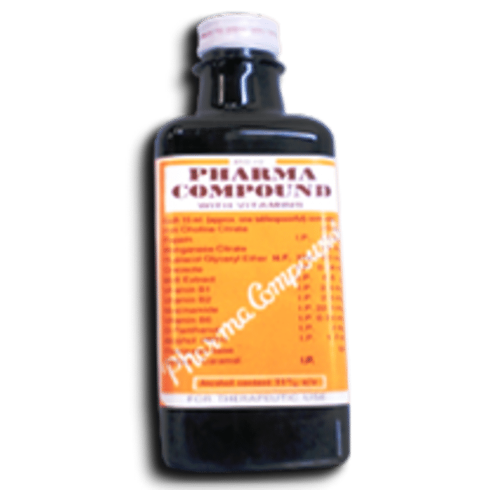 Pharma Compound contains Iron Choline Citrate - 20 mg, Papain - 20 mg, Manganese Citrate - 15 mg, Guaicol Glyceryl Ether - 50 mg, Creosote - 0.04 ml, Malt Extract - 0.5 g, Vitamin B1 - 2.5 mg, Vitamin B2 - 2.5 mg, Niacinamide - 22.5 mg, Vitamin B6 - 0.75 mg and D-Panthenol - 3 mg. Role of key ingredients: Creosote and Guaicol both have antiseptic properties. Guaicol acts as an expectorant and releases the mucus from the lungs and throat. So the bacteria are removed along with the mucus. Vitamins and other ingredients are given as tonic to gain energy and well being; as the patients feel hungry after consuming Guaicol. Pharma Compound Liquid is used as a restorative tonic with two respiratory antiseptics. Directions of use: Take Pharma Compound Liquid orally. Use under medical supervision.