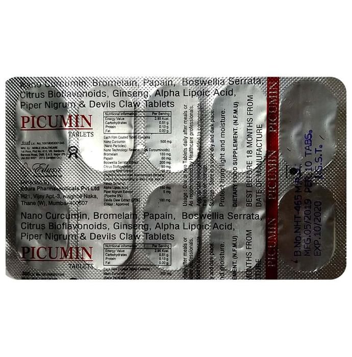 Picumin Tablet is a formulation that can help replenish nutritional deficiencies. It can help improve joint and bone health. It is rich in antioxidants that may help deal with free radicals Moreover, it can support general health and well-being. | Key Ingredients: Nano curcumin Bromelain Papain Boswellia serrta extract Citrus Bioflavonoids Ginseng root extract Alpha lipoic acid Piper nigrum Devils claw extract | Key Benefits: This tablet can help improve mobility of joints It can help deal with pain and inflammation of joints It may help in reducing joint weakness and brittleness This tablet can strengthen the joint by enhancing its composition | Directions For Use: Use as directed on the label or as advised by your healthcare provider. | Safety Information: Read the label carefully before use Do not exceed the recommended dosage Store in a cool and dry place away from direct sunlight Keep out of reach of children