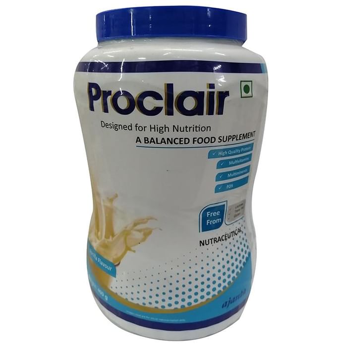 Proclair Powder It is ideally suited for people who cannot get enough protein from their foods. It is free from lactose, fat and cholesterol and aids protein synthesis. | Key Ingredients: Calcium Sodium Zinc | Key Benefits: Enriched with antioxidant properties that prevent oxidative stress and promote cardiac health The micro and macronutrients, along with other minerals, correct nutritional deficiencies Ideal for healthy, on-the-go nourishment for men, women and kids | Directions For Use: Use as directed on the label or as advised by your healthcare provider | Safety Information: Read the label carefully before use Store in a cool and dry place away from direct sunlight Keep out of reach of children