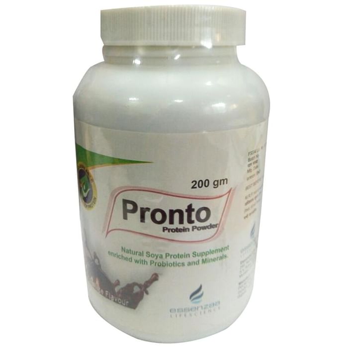 Pronto Protein Powder is a soy protein immuno- nutrition for children and adults. It contains proteins, carbohydrates, fat, calcium, phosphorus, magnesium, potassium, vitamin D3, Cocoa powder and probiotics. Key benefits of Pronto Protein Powder : It helps in protein deficiency and favourable growth. It reduces the incidences of diabetes, blood pressure and cholesterol levels. The Probiotics helps in increased nutrition absorption and keeps the G.I tract healthy. Direction for use: 5 gm to 10 gm with milk, twice daily. Add 1 to 2 tablespoons to 1 cup of lukewarm milk. Stir well to form a uniform liquid and drink immediately or as directed by the physician. Safety information: Read the instructions on the label carefully. Keep out of the reach of the children. Use under medical supervision.