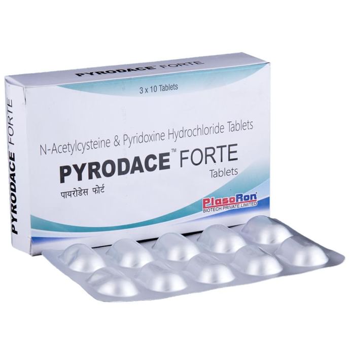 Pyrodace Forte Tablet Pyrodace Forte Tablet contains N-Acetyl Cysteine (NAC) and Pyridoxamine. The health benefits of Vitamin B6 or Pyridoxamine include stimulating co-enzymatic activities, protecting the immune system, and having positive effects on metabolism, premenstrual syndrome, hormone control, emotional disorders, skin conditions, cardiac diseases, kidney disorders, carpal tunnel syndrome, multiple sclerosis , anemia, arthritis and influenza. N-acetylcysteine (NAC) is converted in the body to the amino acid L-cysteine which is a building block for the production of countless proteins needed by the body. While NAC supplementation undoubtedly provides the body with all the benefits that derive from L-cysteine, the principal reason it is used as a supplement is to increase the body’s production of glutathione — a very important antioxidant that protects cells from being damaged or killed by certain metabolic byproducts. Pyrodace Forte helps in regulating the metabolism, in pulmonary and respiratory ailments, neuro-degenerative diseases and in immune system problem. Use under medical supervision.