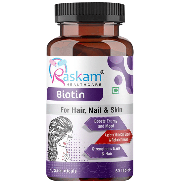 Raskam Healthcare Biotin Tablet Raskam Healthcare Biotin Tablet is a dietary supplement that can support hair, nail and skin health. It can reduce the brittleness of nails. It can promote glowing skin, lustrous hair and stronger nails. It can prevent hair, skin and nail disorders. This supplement can uplift mood and energy. It also assists with cell growth and tissue regeneration.
