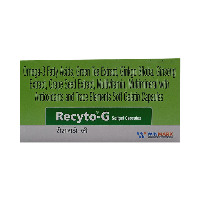 Recyto-G Softgel Capsule contains Omega 3 fatty acids, which aid in the management of joint pain and inflammation. It also contains Ginseng extract, which aids in the fight against free radicals, lowers inflammation, and protects cells. | Key Ingredients: Omega 3 fatty acid Green tea extract Ginkgo biloba Ginseng extract Grape seed extract | Key Benefits: Recyto-G Softgel Capsule is beneficial for supporting overall health and improves immune response It contains Omega 3 fatty acid which helps in managing joint pain and inflammation and relieves eczema It also contains Ginseng extract which aids in combating free radicals, reduces inflammation and prevents cell damage | Directions For Use: Use as directed on the label or as advised by your physician. | Safety Information: Read the label carefully before use Do not exceed the recommended dosage Store in a cool and dry place away from direct sunlight Keep out of reach of children
