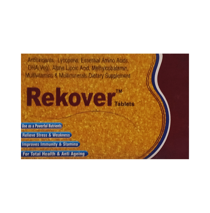 Rekover Tablet boosts the immune system with potent multivitamins and multi-minerals. With the anti-inflammatory and antioxidant capabilities of multivitamins, it inhibits cell structure damage brought on by infections and also safeguard cells from free radicals. These tablets benefit various health problems like skin diseases, ageing, hair care, immunocompromised people, etc. | Key Ingredients: Antioxidants Lycopene Essential amino acids DHA Alpha lipoic acid Methylcobalamin Multivitamins Multi minerals | Key Benefits: Due to its potent antioxidant properties, Rekover capsules helps prevent oxidation-related tissue damage These capsules promote healthier skin, hair and nails with biotin It promotes heart, and cardiovascular health and also helps in breaking down fat cells and lowering LDL cholesterol levels It supports healthy haemoglobin levels and circulatory system functioning It strengthens your immune system with power-packed multivitamins and multiminerals It prevents cell structure damage due to pathogens and also protects cells from free radicals with the anti-inflammatory and antioxidant properties of multivitamins It provides healthy support to metabolism, body cells, nerve and heart health in men with B-complex vitamins like thiamine, riboflavin, niacin and folic acid | Directions For Use: Use as directed on the label or as advised by your healthcare provider. | Safety Information: Read the label carefully before use Store in a cool and dry place away from direct sunlight Keep out of reach of children