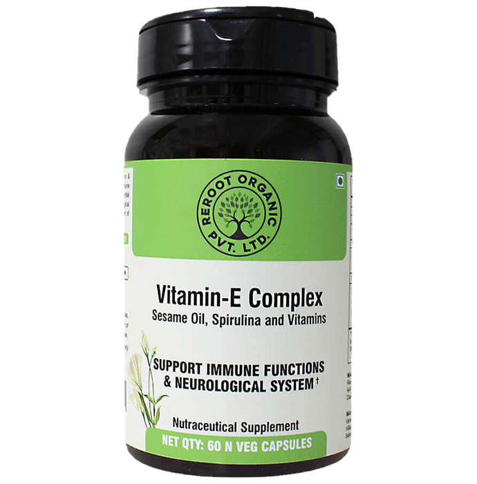 Reroot Organic Vitamin-E Complex Veg Capsule Reroot Organic Vitamin-E Complex Veg Vitamin E capsules may aid in the maintenance of cellular health, appropriate immune function, and a healthy vascular system. Vitamin B5 may help support the production of overall energy and proteins for a healthy immune and nervous system. Spirulina and Vitamin C may help to enhance the immune system's production of collagen maintain skin and bone health. Essential fatty acids of sesame oil and Zinc may support skeletal and neurological functions as well as healthy ageing. For a healthy immune and nervous system. Vitamin B5 may aid in the creation of overall energy and proteins.