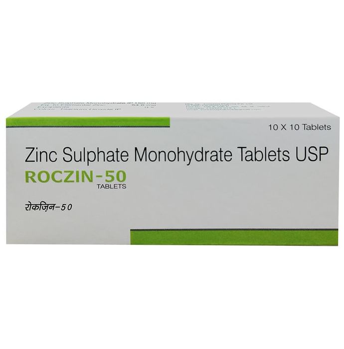 Roczin 50 Tablet is a tablet that can help replenish nutritional deficiencies. It can help regulate zinc levels in the body. Moreover, it can help in protein and DNA synthesis. | Key Ingredients: Zinc sulphate monohydrate | Key Benefits: This tablet can be effective in replenishing zinc deficiencies It can support proper growth and development of the body It can boost the immune system to combat various illnesses This tablet can provide relief from acne and inflammation | Directions For Use: Use as directed on the label or as advised by your healthcare provider. | Safety Information: Read the label carefully before use Do not exceed the recommended dosage Store in a cool and dry place away from direct sunlight Keep out of reach of children