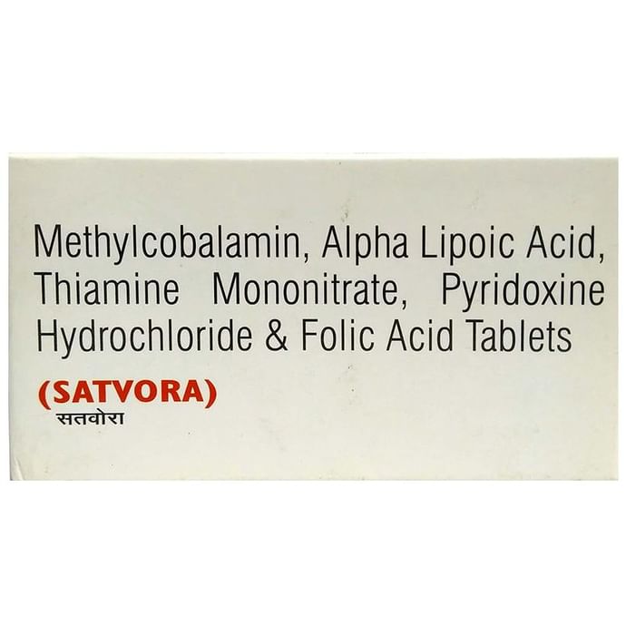 Satvora Tablet is a dietary supplement that can help enhance the function of the nervous system. The formula can help regulate blood pressure levels. It is a health supplement that can help maintain a healthy body. | Key Ingredients: Mecobalamin Alpha Lipoic acid Folic acid Thiamine mononitrate Pyridoxine hydrocloride | Key Benefits: It can be beneficial in managing damage caused to the nervous system Serves as a supplement that can help regulate blood pressure The methylcobalamin can help stimulate the production of a neurotransmitter that protects the brain against excitotoxins It can help stimulate the production of healthy red blood cells | Directions For Use: As directed by the healthcare professional | Safety Information: Self-medication is not advisable Store in a cool, dry place, away from direct sunlight Keep out of the reach and sight of children Do not exceed the recommended dosage