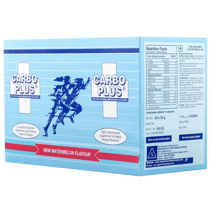 Carbo Plus 25gm Sachet is an oral supplement with ideal blend of simple and complex carbohydrate. It is preferred by athletes of all disciplines. | Key Ingredients: Maltodextrin Fructose Dextrose Sucrose L-Carnitine Hydrochloride Vitamins Minerals Citric Acid [330] Natural Flavour | Key Benefits: It is a carbohydrate supplement for athletes for instant energy recovery It is rapidly absorbed with least glycemic index carbohydrate It is fortified with important B-Complex vitamins and minerals It is ideal for patients of all ages recovering from post operative period, illness and convalescence, gastro intestinal disorders, general debility, fluid and electrolyte imbalance Available in flavours like lemon, orange, watermelon, and green apple, easy to prepare and use | Directions For Use: For Adults: Recomended 100 gm in 1 ltr per sesssion or as advised by Sports Nutritionist/Coach For children above 8years old: Recomended 25 gm in 250ml or 50 gm in 500 ml per session depending on intensity of training | Safety Information: Read the label carefully before use Store in cool and dry place, away from direct sunlight Keep out of reach of the children Do not exceed the recommended dosage As dietary supplement, not intended to cure or prevent any disease If you are taking any prescribed medication or have any medical conditions always consult doctor or healthcare practitioner before taking any Vitamins and Food supplements